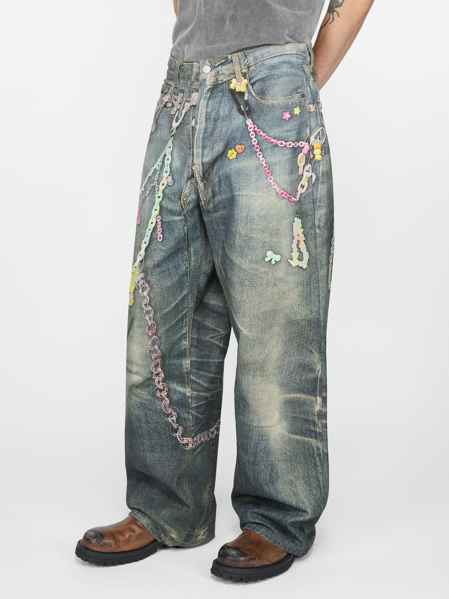 丈感、ワイドさともにこのデニムパンツはパーフェクトです。もっとワイドでもいいですが、これより細いとうまく靴が隠れません。この写真くらいのワイドパンツが合わせやすくて初心者にお勧めです。
