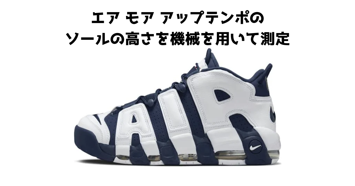 今回はエア モア アップテンポ(通称モアテン)のソールの高さ(ヒールの高さ)を測定します。外見のごつさからかなりの厚底スニーカーだと予想できますが、結果はどうでしょうか。